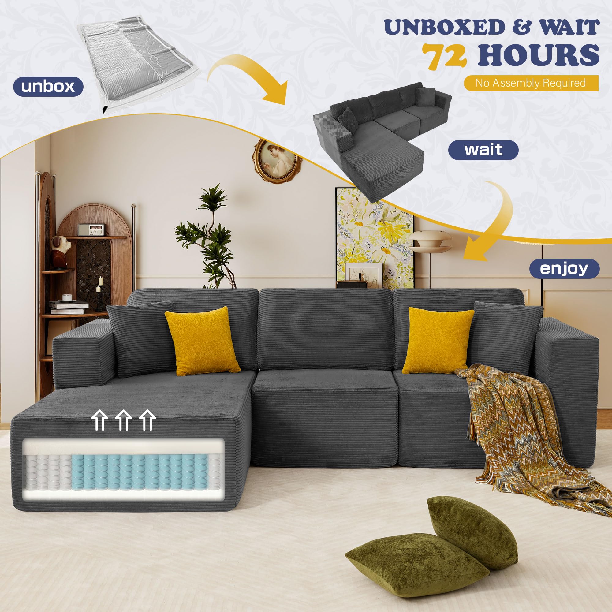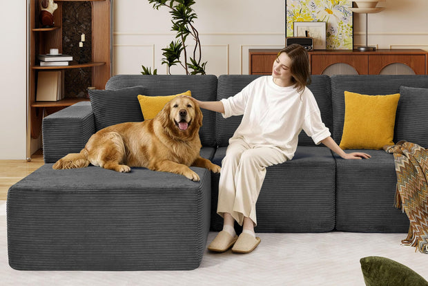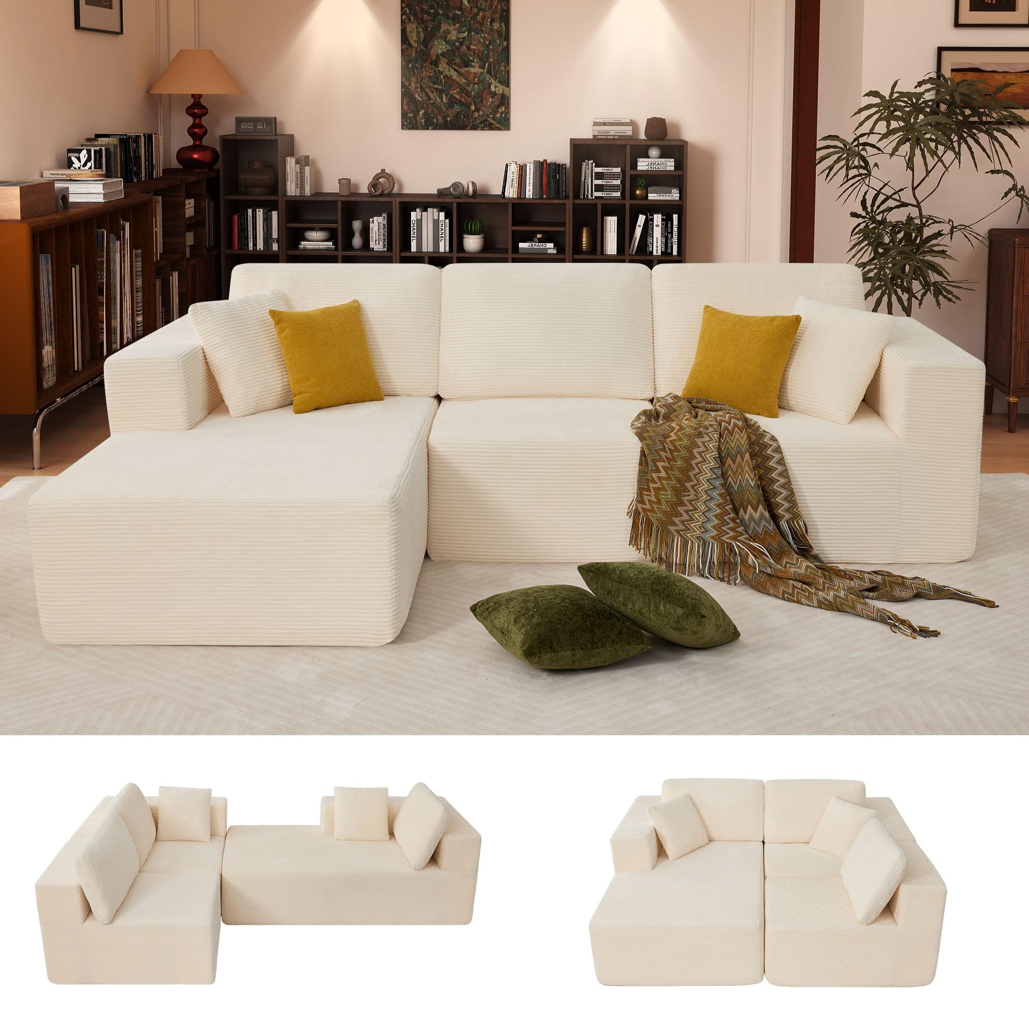 JONPONY 109” Cloud Sectional Couch, Boneless Modular Sofa with L-Shape Chaise, Deep Seat Corduroy Couch, No Assembly Required, Modern Upholstered Sectional for Living Room Apartment Bedroom