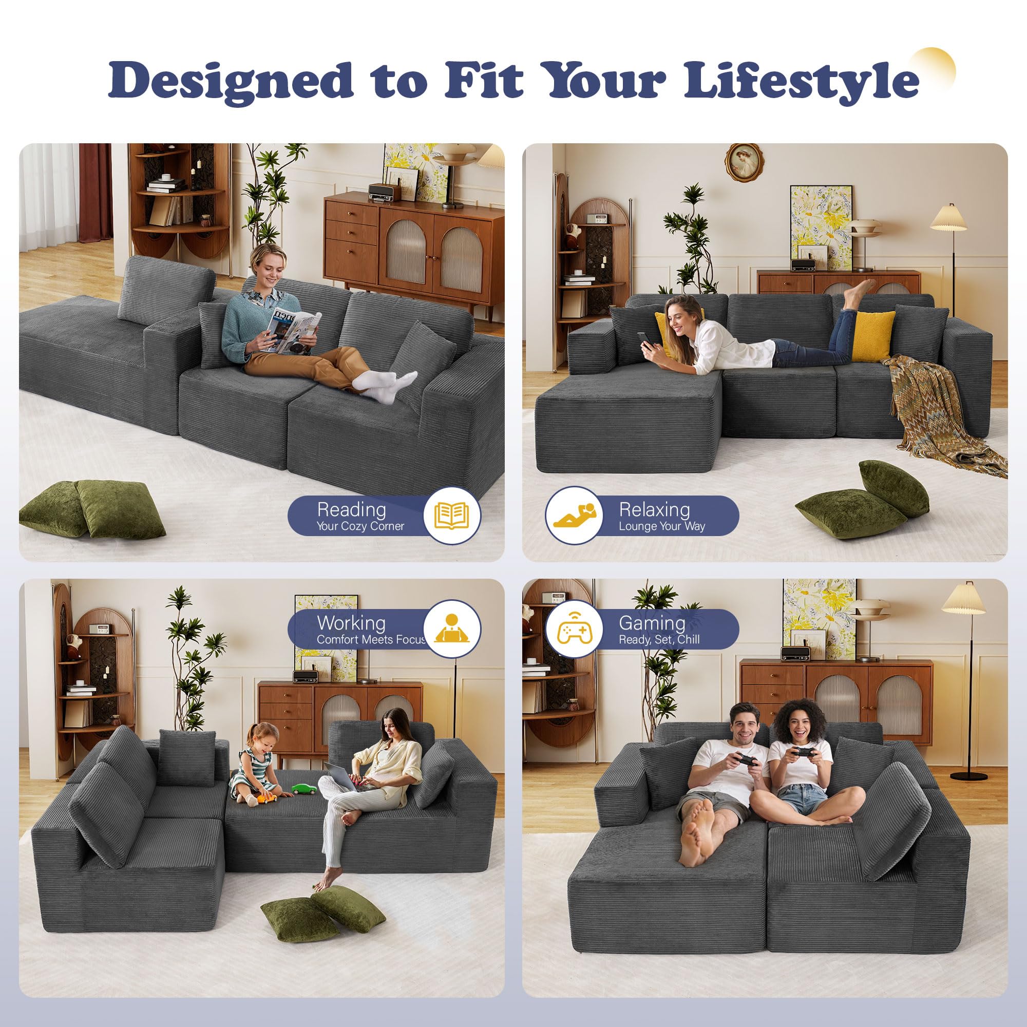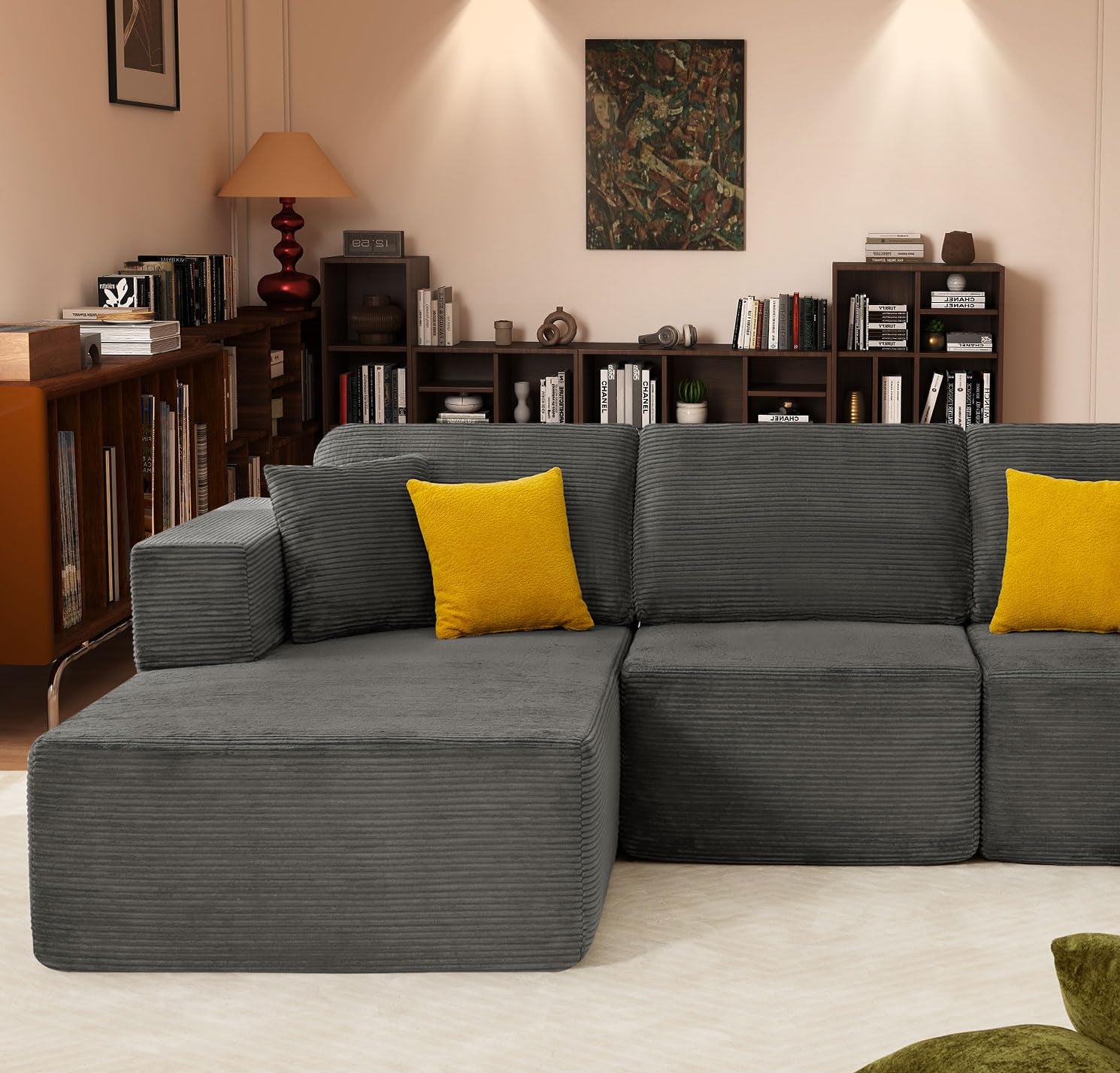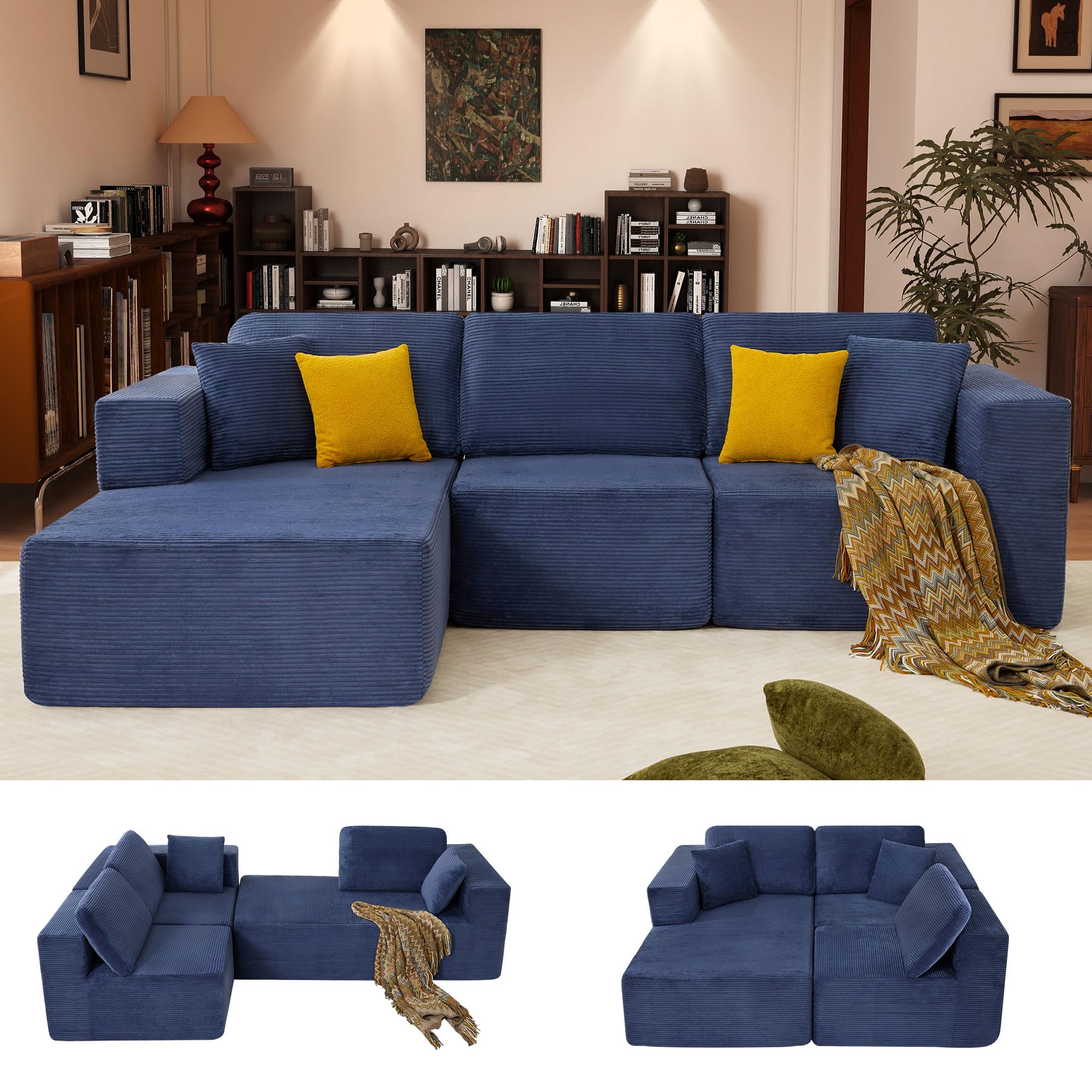 JONPONY 109” Cloud Sectional Couch, Boneless Modular Sofa with L-Shape Chaise, Deep Seat Corduroy Couch, No Assembly Required, Modern Upholstered Sectional for Living Room Apartment Bedroom