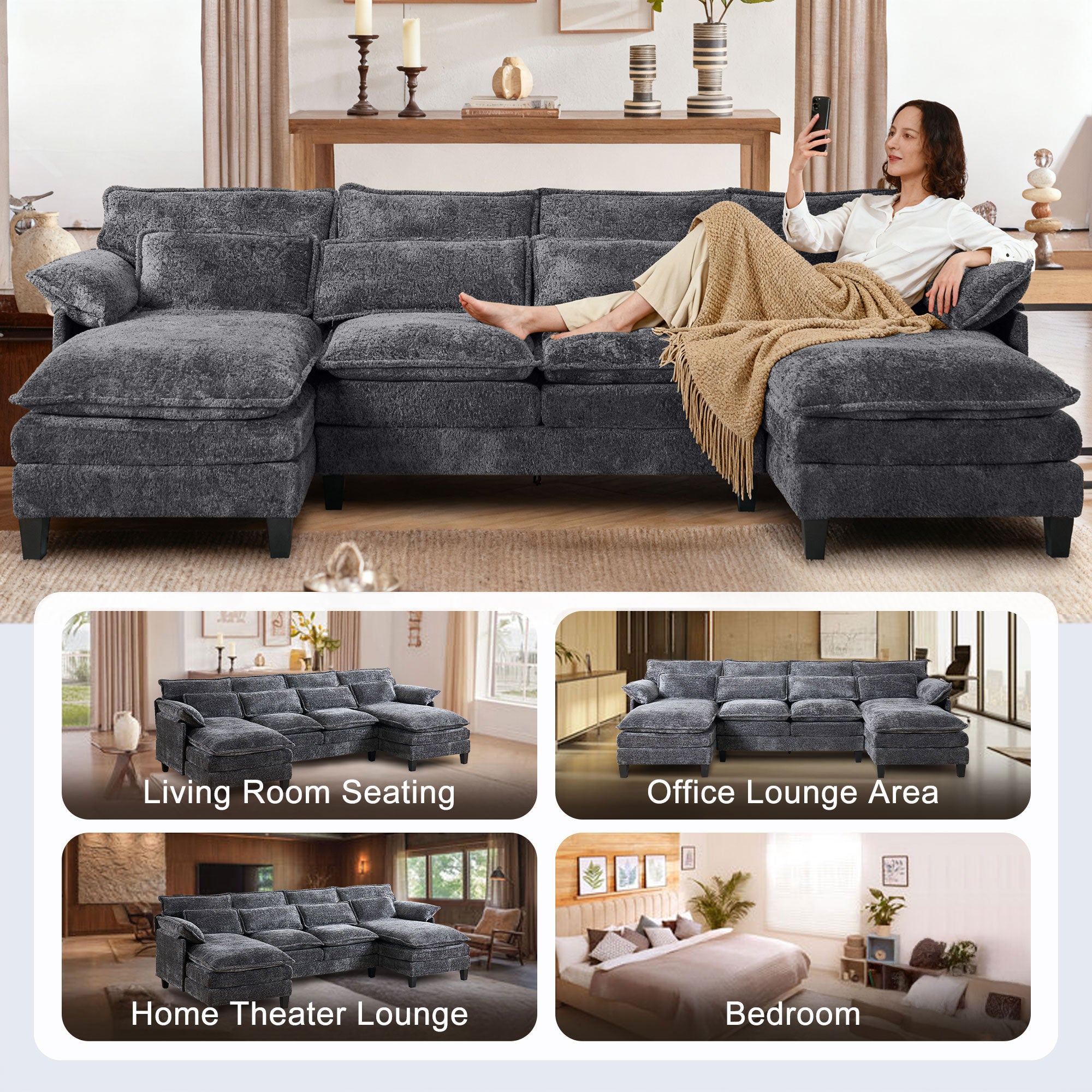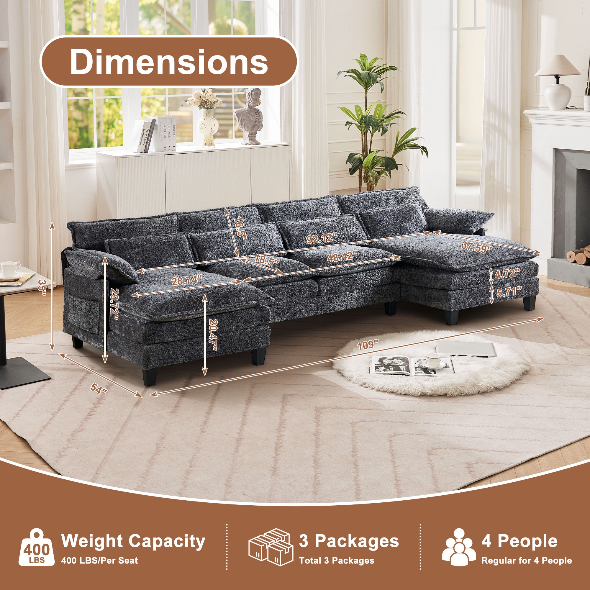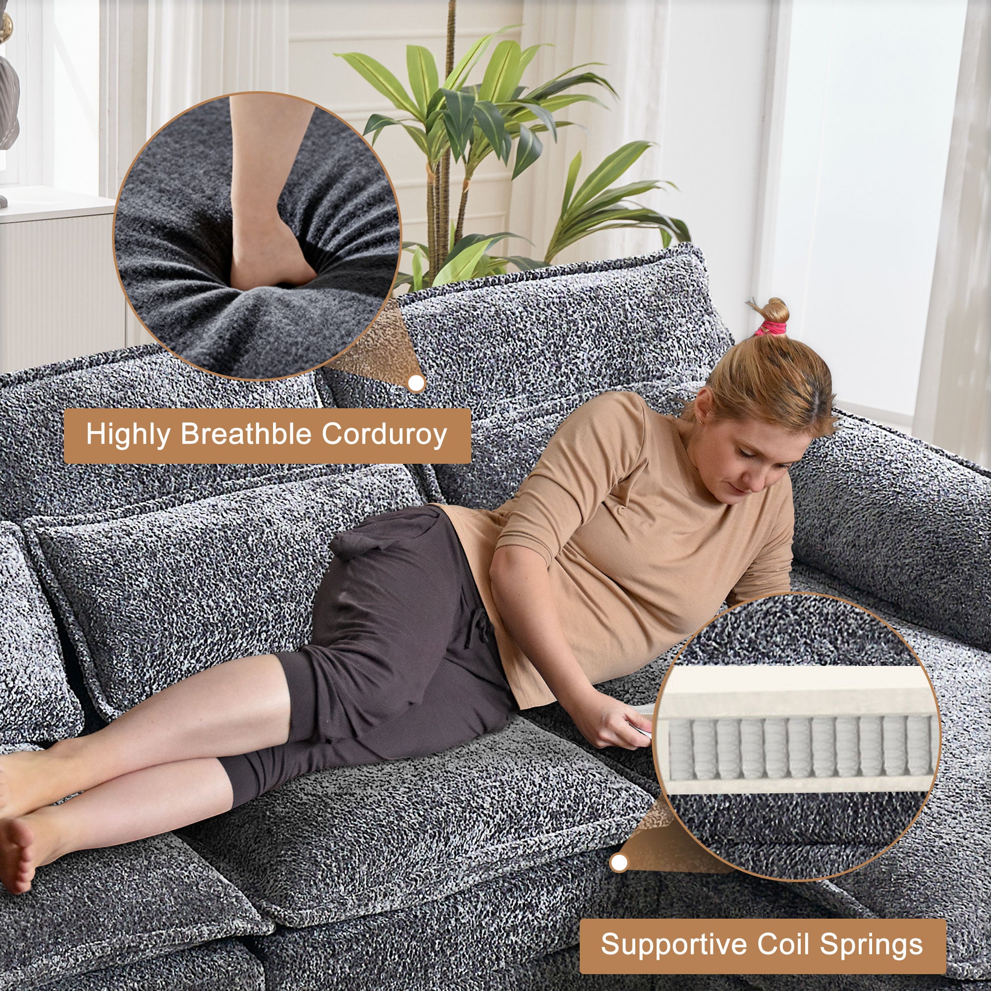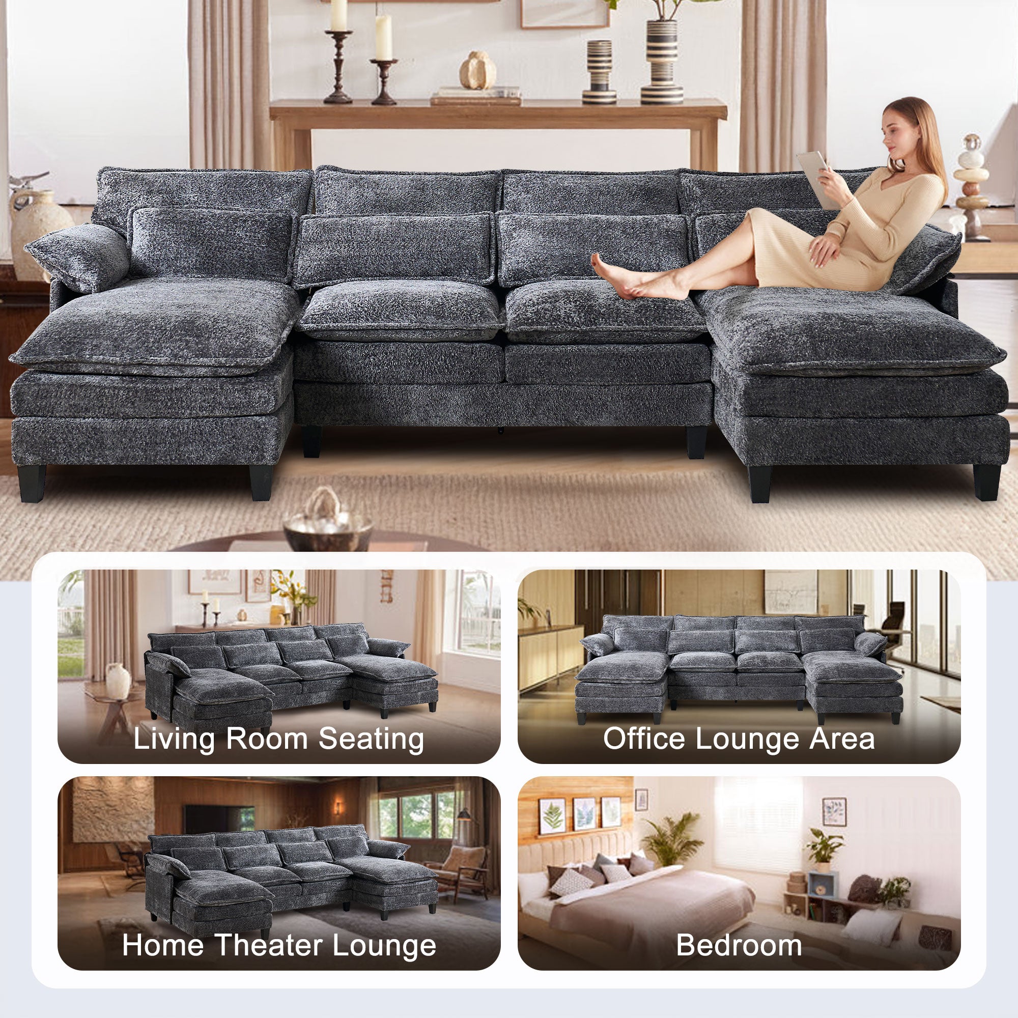 JONPONY 109" Modular Sectional Sofa,Boucle Couch Set,U-Shaped Sleeper Sofa for Living Room,Grey