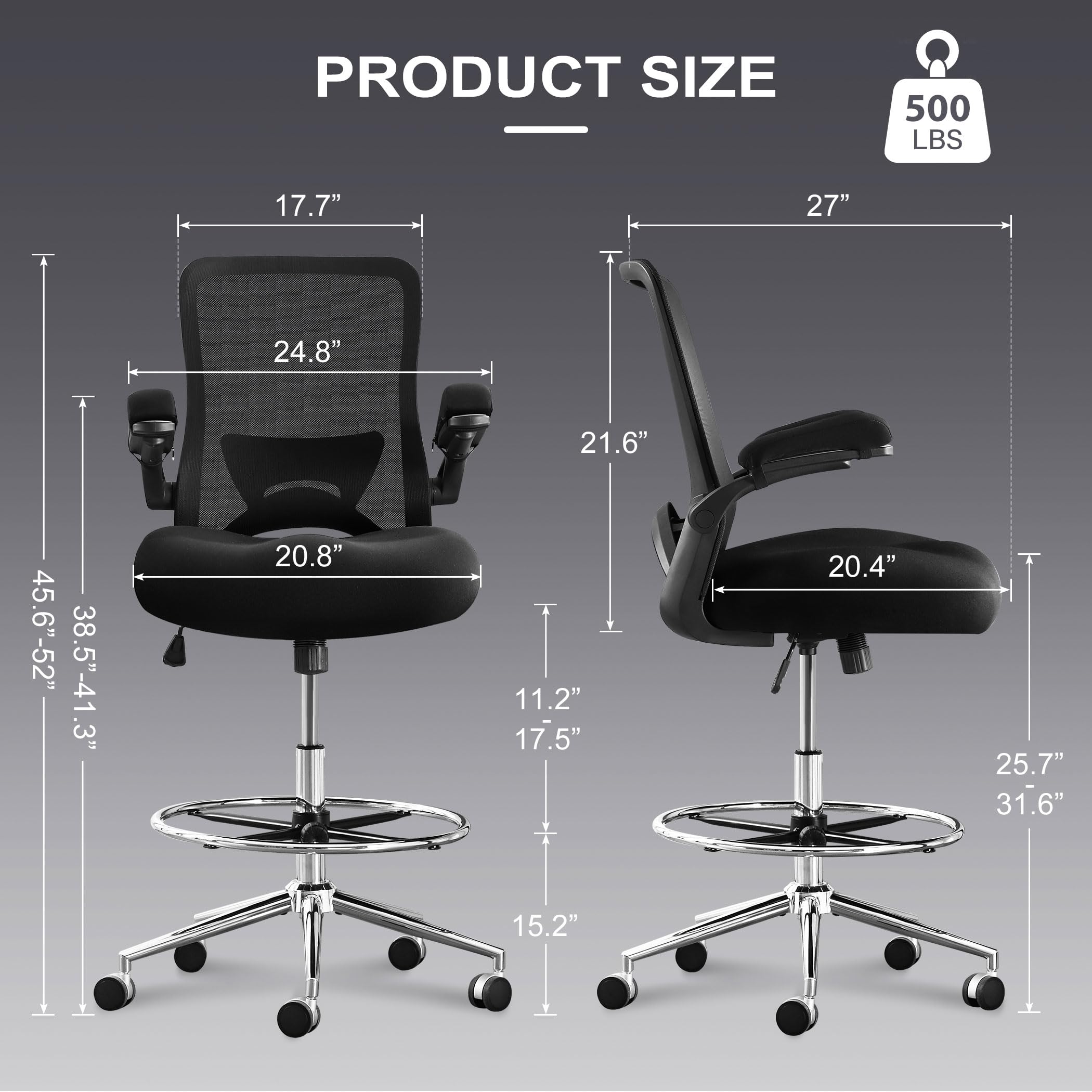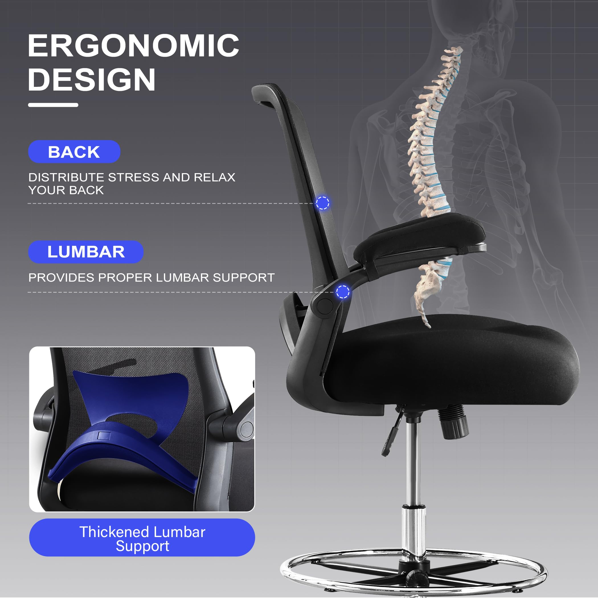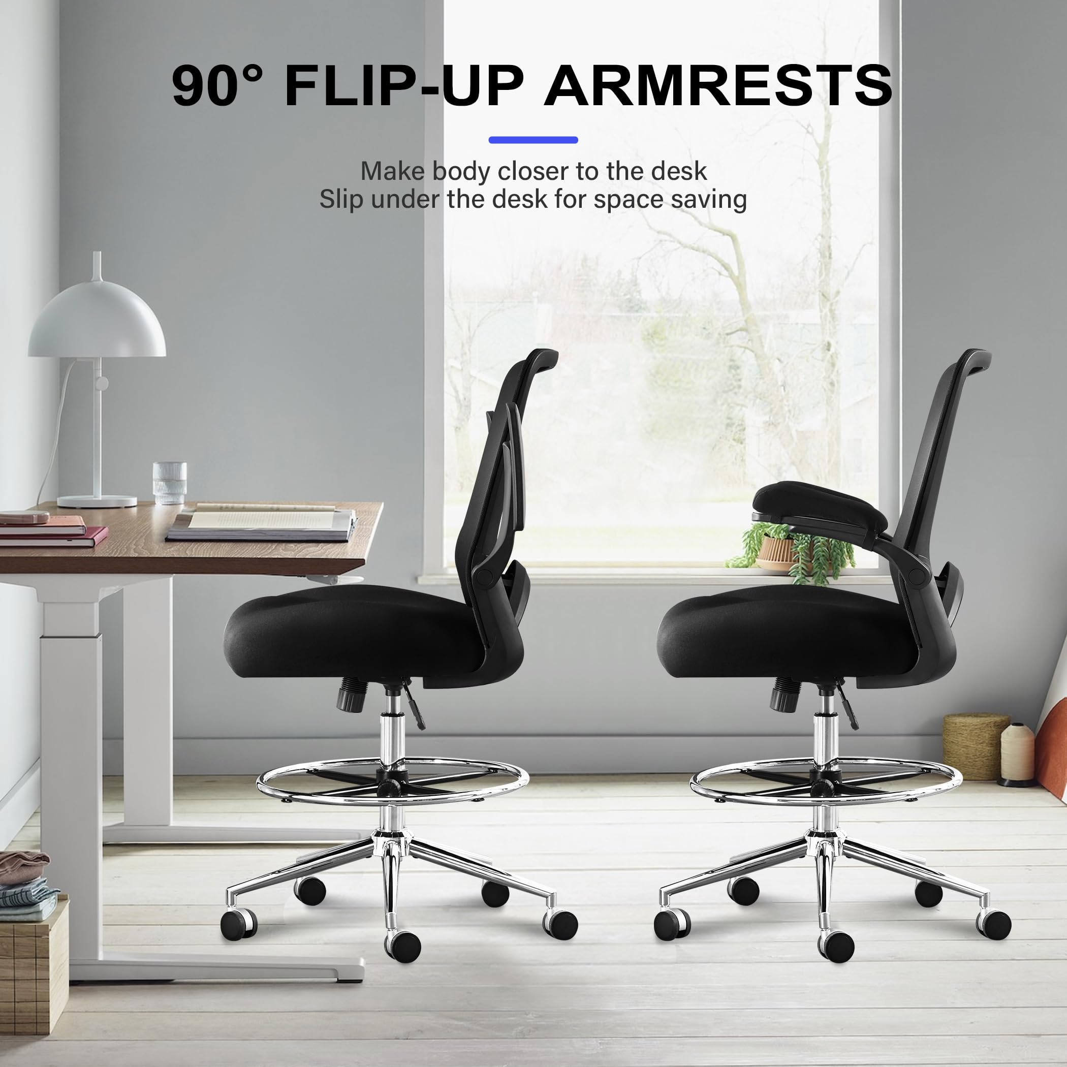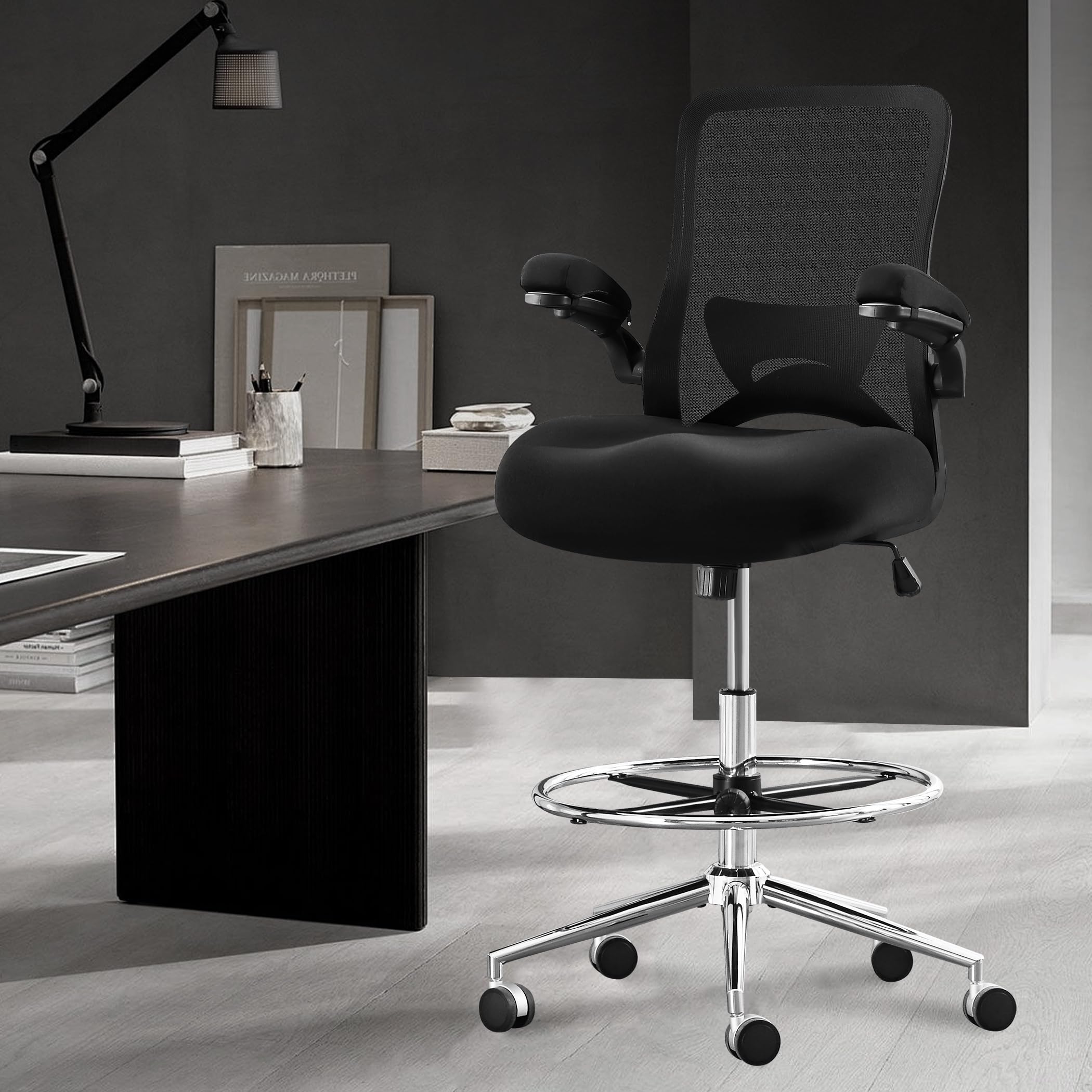 JONPONY 500lbs Tall Drafting Chair for Standing Desk with Flip-up Armrests, Pressure Locking Casters, W-Shape Thicken Cushion, Breathable Mesh Extended Height Office Chairs,Black