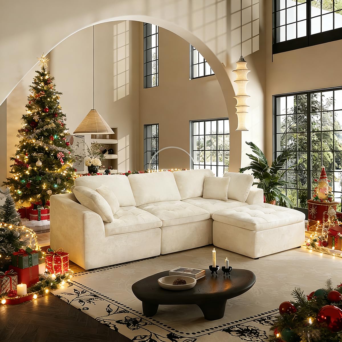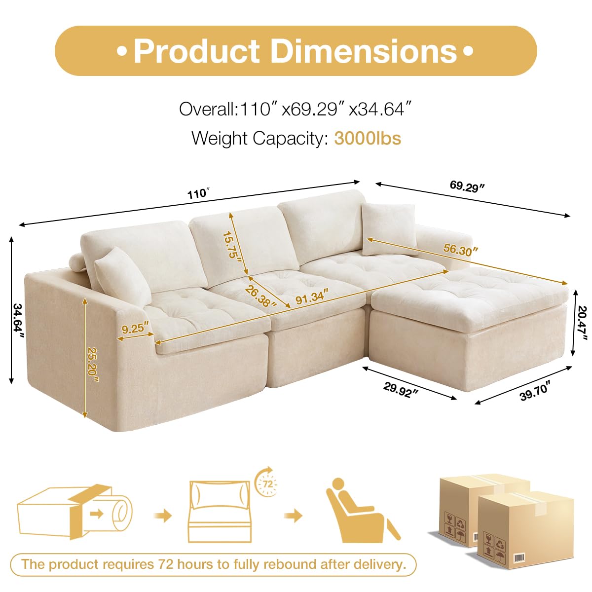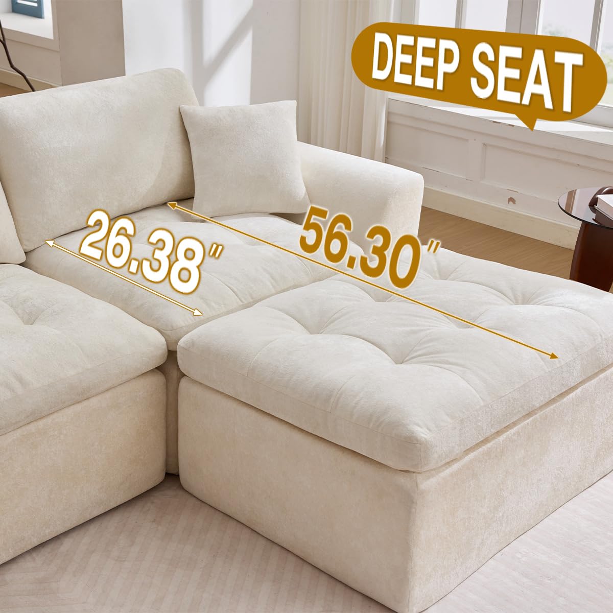 JONPONY 110" Cloud Sectional Couch for Living Room, Upholstered L-Shape Modular Sofa with Movable Ottoman, 3-Seater Deep-Seat Foam Couch, Comfortable Convertible Sectional for Home & Apartment(Beige)